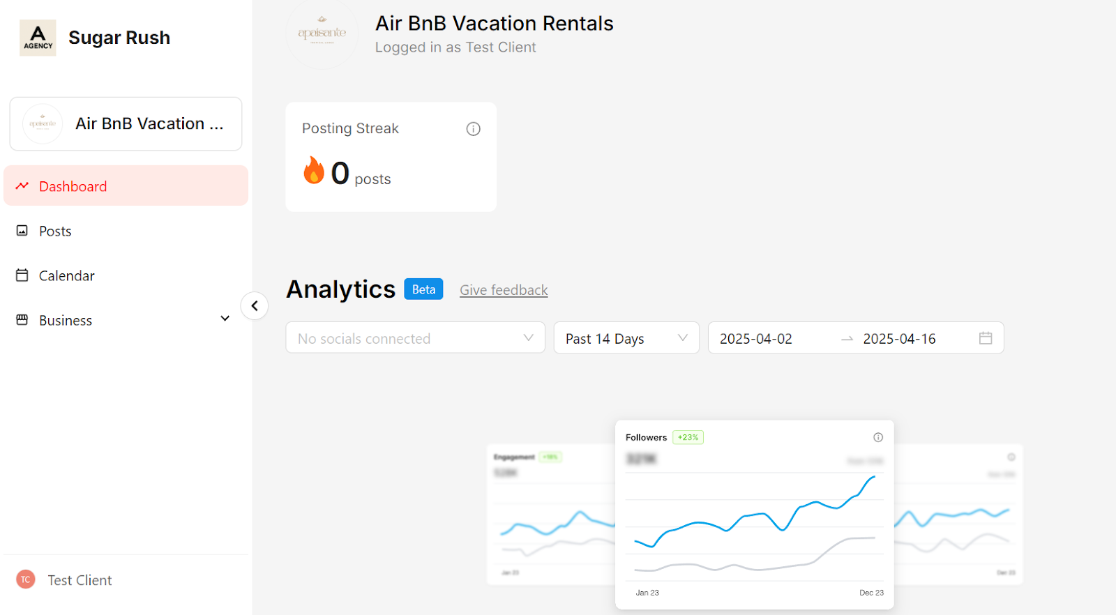 Posts - All posts marked as ready for review by the agency will appear here. Clients can leave comments, approve posts, or request changes directly from this tab. The agency will get a notice for any request or comments made on each post.