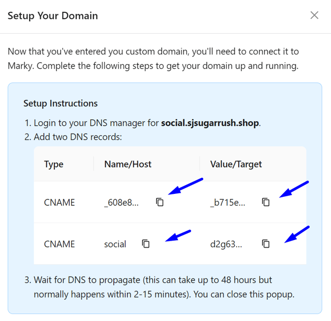 - Make sure you are adding both two DNS records from Marky to your DNS provider. Usually you add new records under Domain >> Advance DNS.