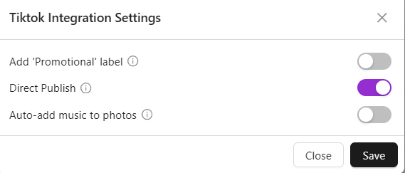 - Direct Publish If enabled, we directly post the content to your feed; if off, we upload content to TikTok drafts for you to complete the post using TikTok's editing flow.