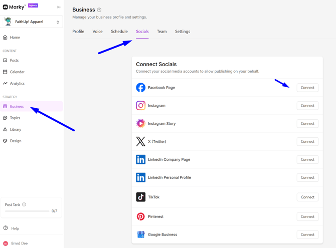 To connect your social media accounts to Marky, go to the Business tab and select Socials. From there, click Connect and follow the prompts. You’ll be asked to log in to your social media account and allow permission to complete the integration.