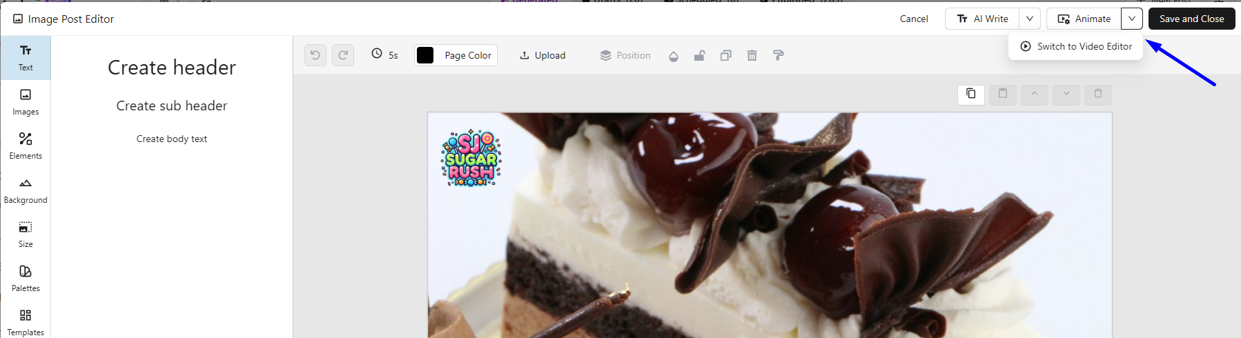 - On the top right of the editor click Switch to Video Editor >> Animate